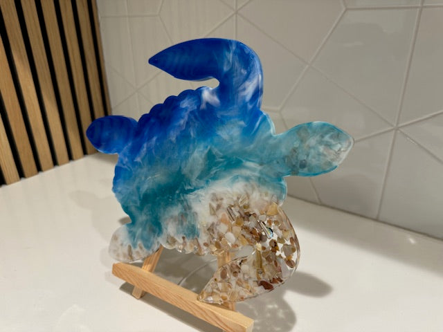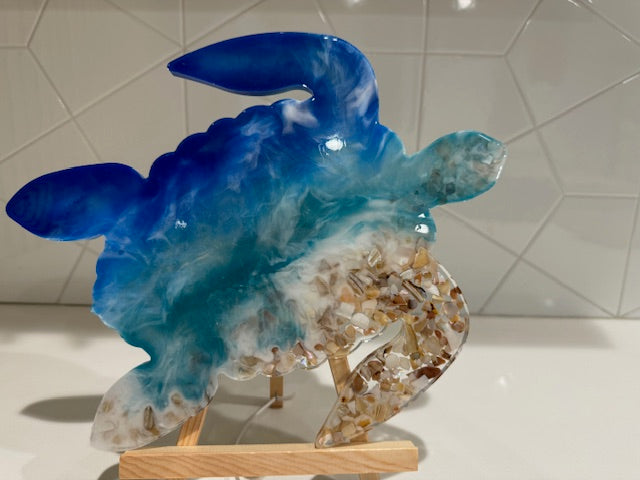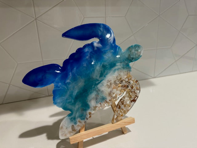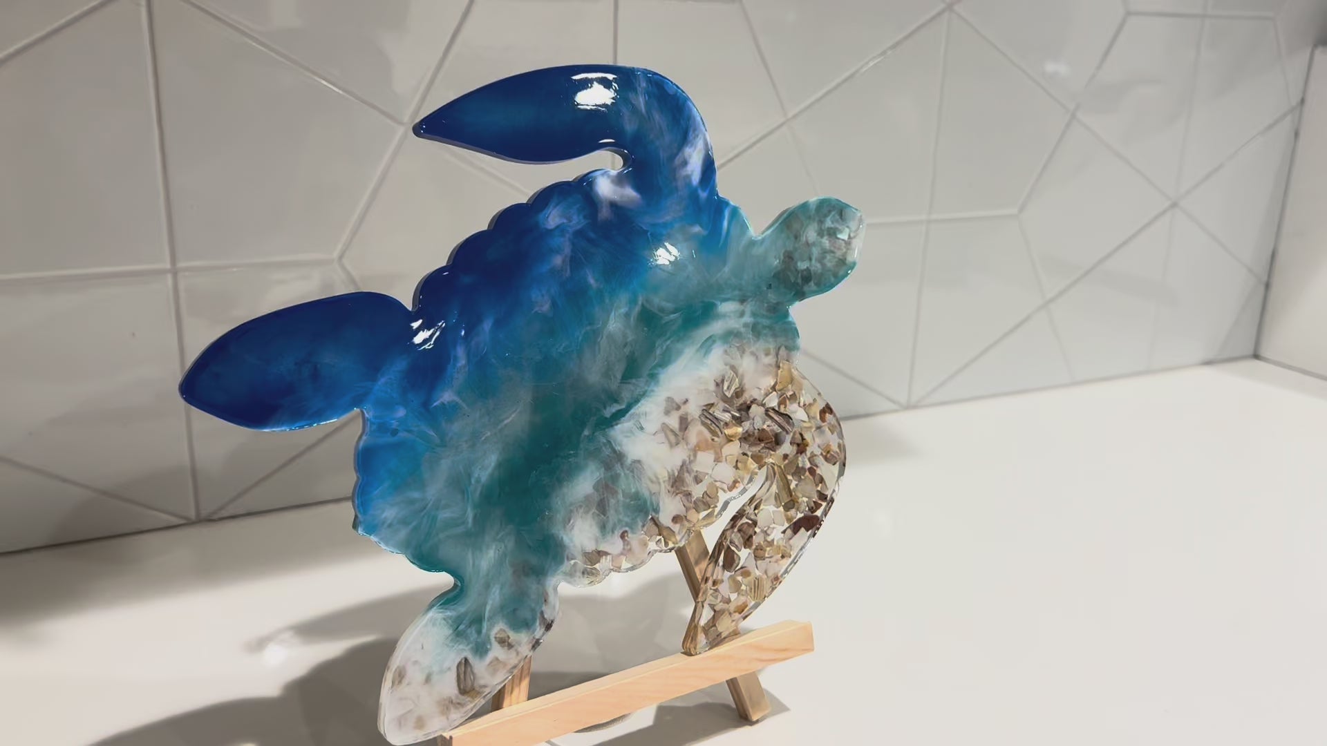 This is where it all started, my love for sea turtles and art. Resin sea turtle size is approx. 13" x 11" x 1/2" This piece has beautiful blue ocean waves and seashell shoreline. The wood easel is included, ready for display.