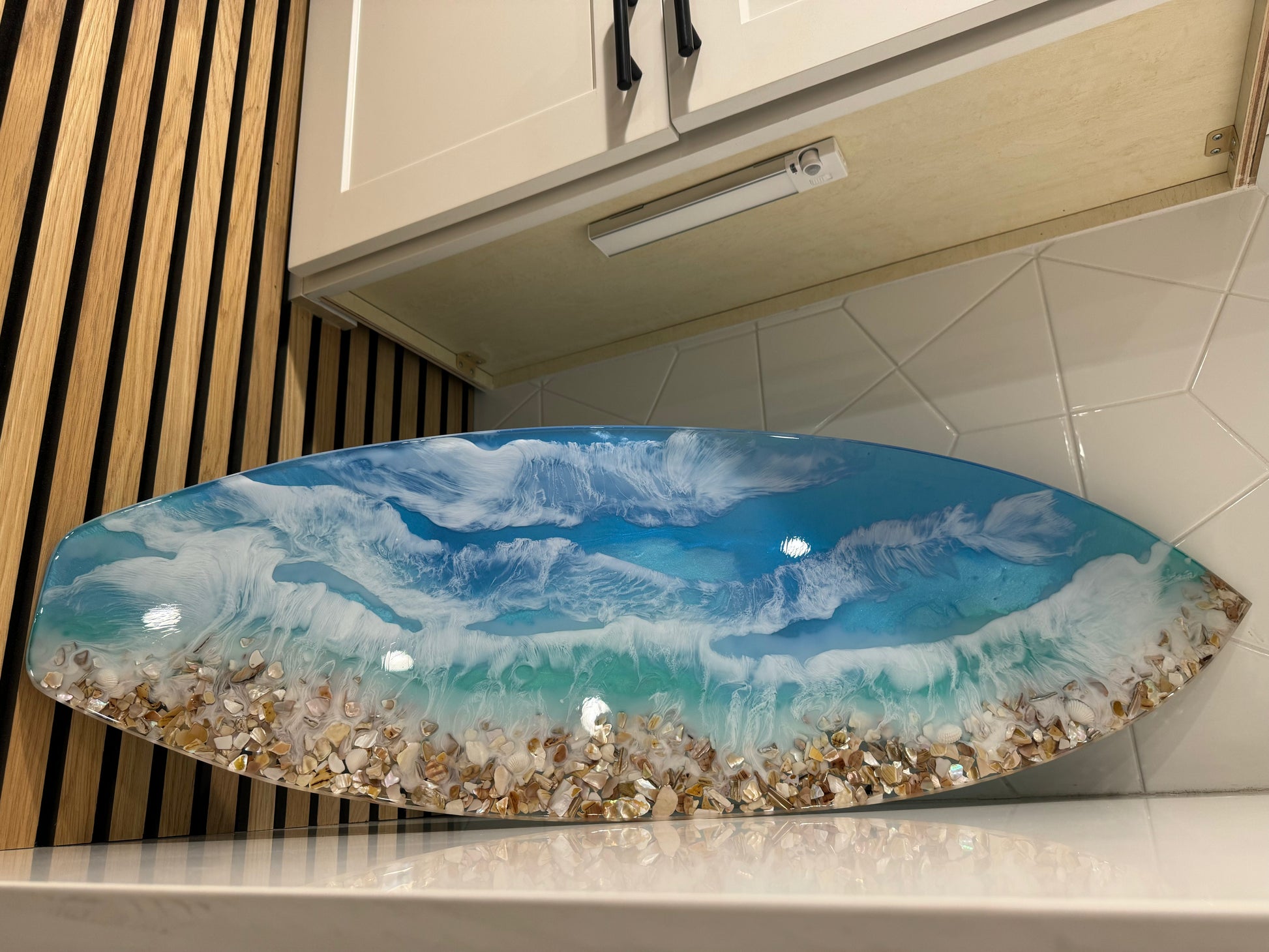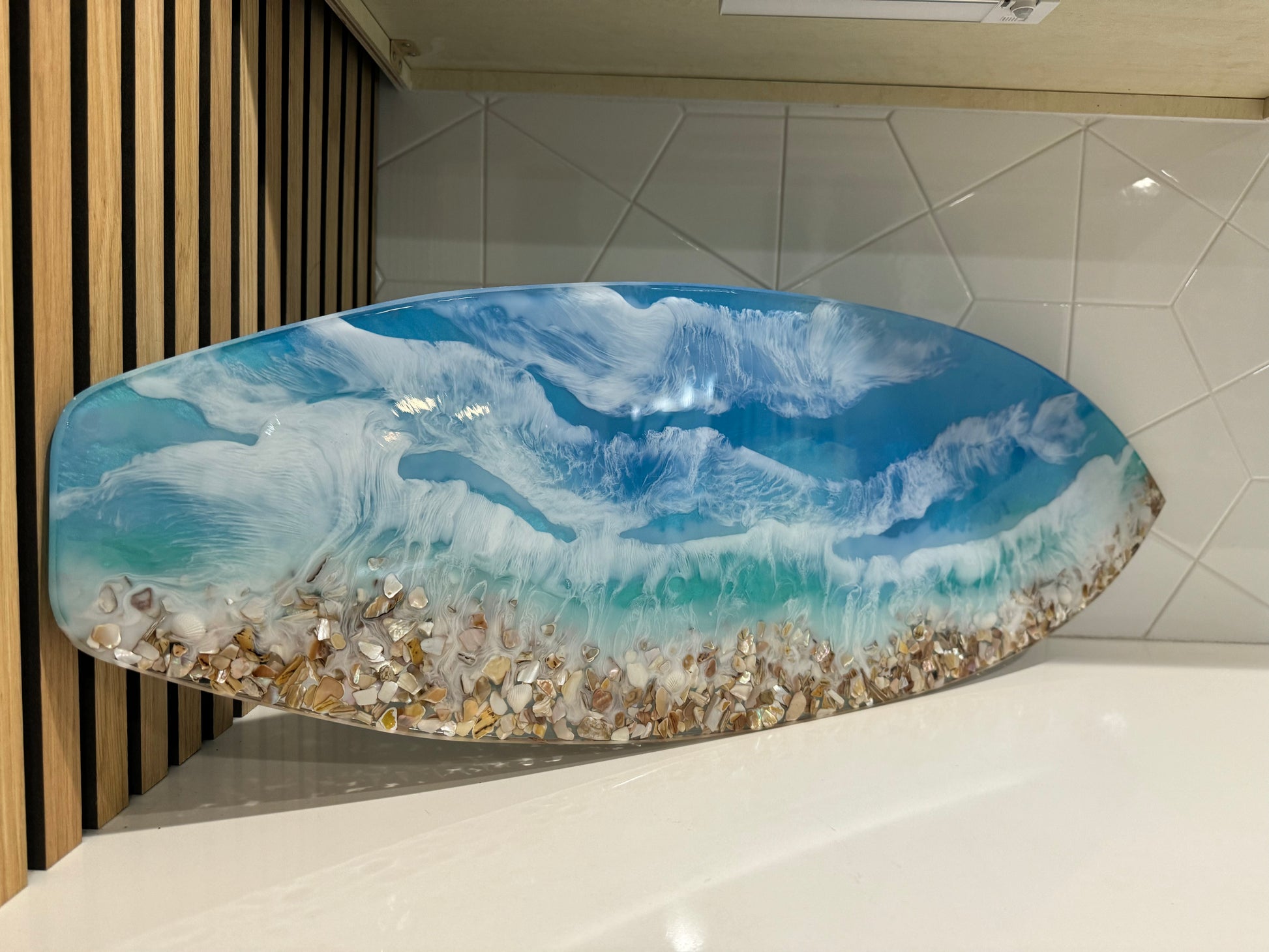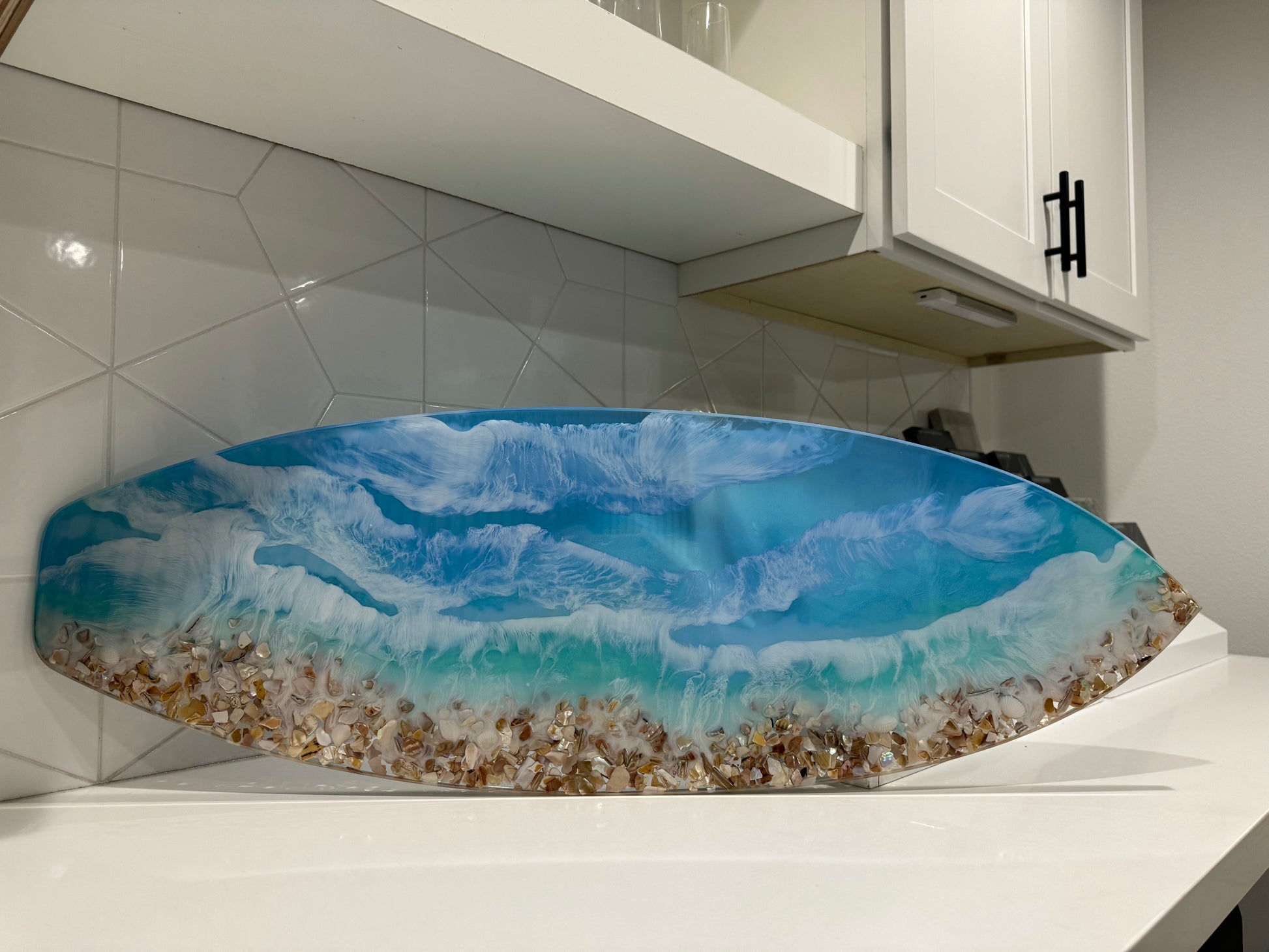 Inspired by my hometown of Huntington Beach. Resin ocean surfboard size is approx. 12" x 36" x 1/2" Multi layer resin pours gives this piece so much dimension with beautiful blue water hues and sea shell shoreline.