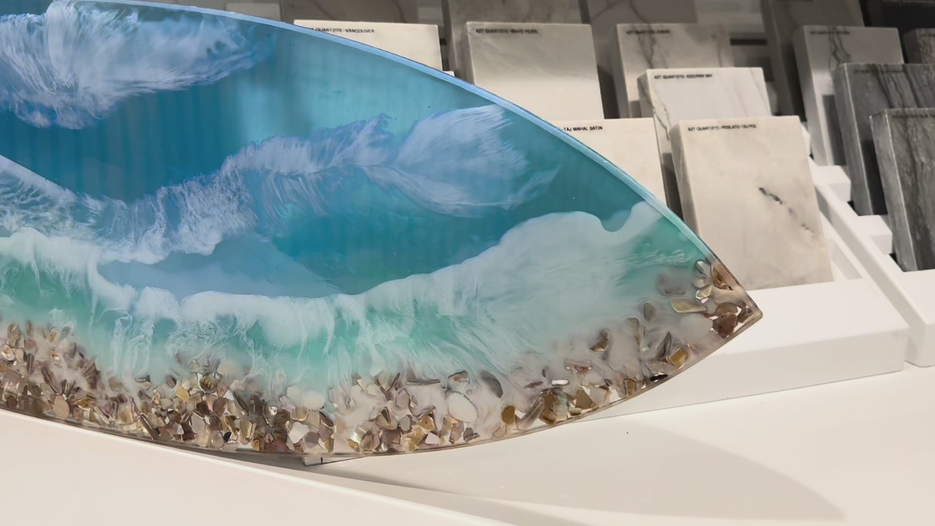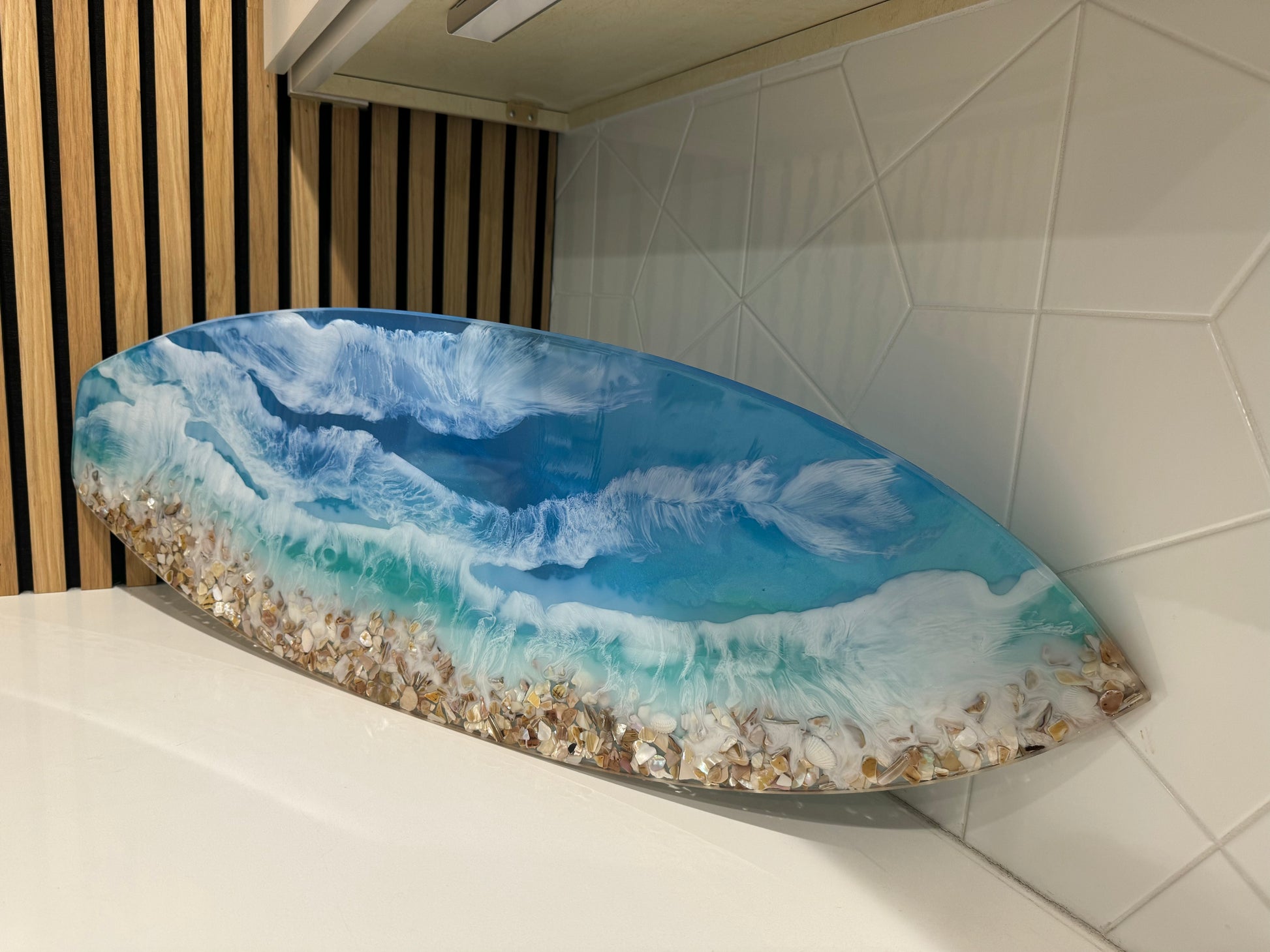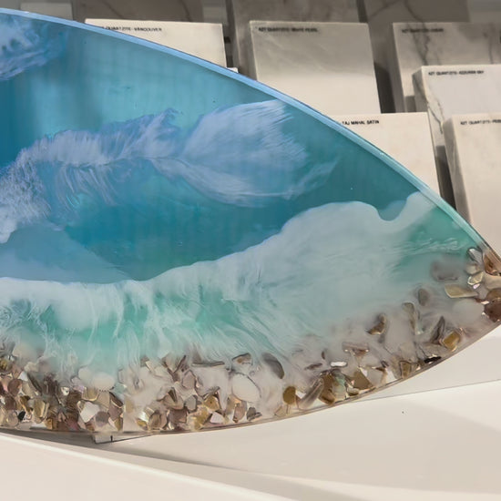 Inspired by my hometown of Huntington Beach. Resin ocean surfboard size is approx. 12" x 36" x 1/2" Multi layer resin pours gives this piece so much dimension with beautiful blue water hues and sea shell shoreline.