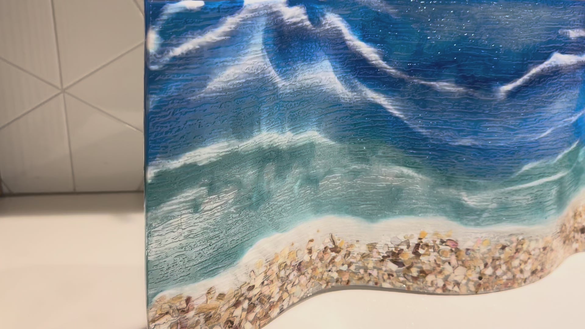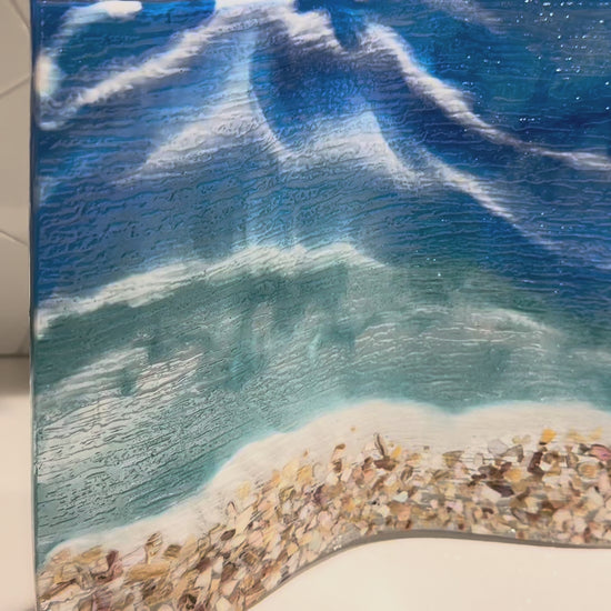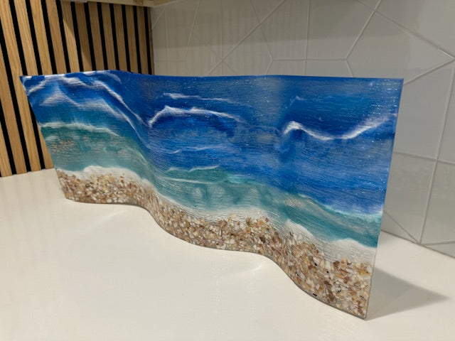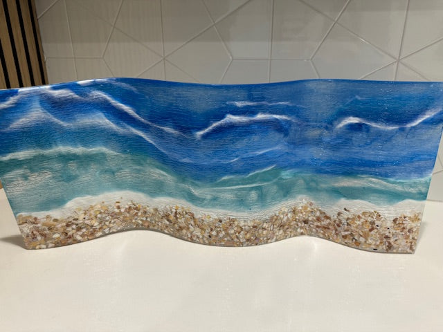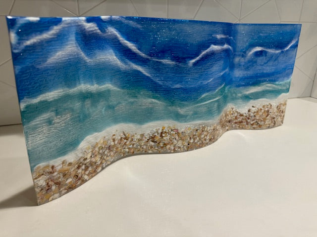 This was hometown HB inspired. Resin ocean wave size is approx. 12" x 29.5" x 3/8" Waterfall texture with blue water hues and seashell shoreline.