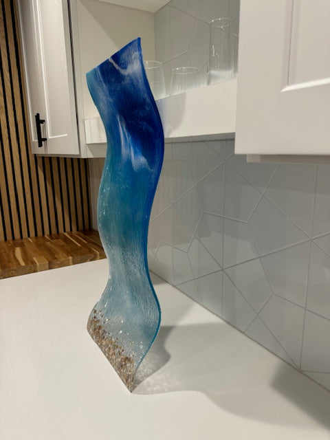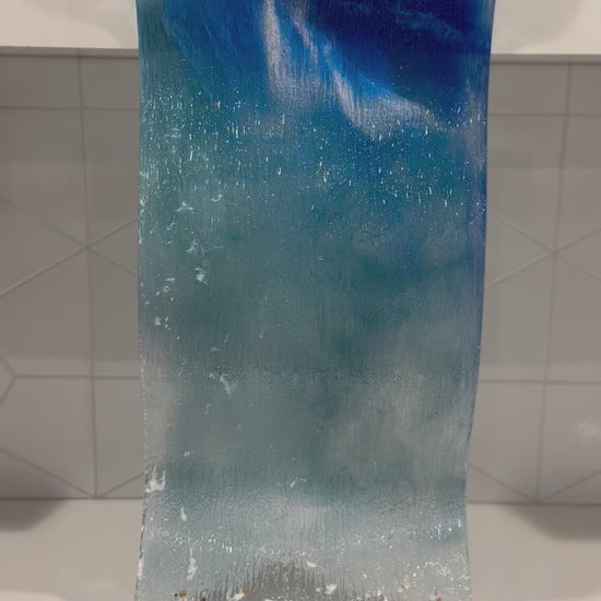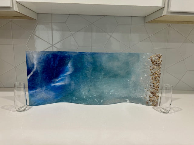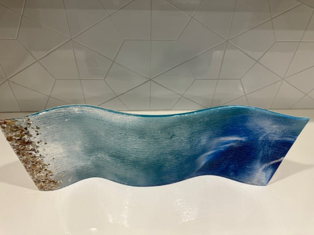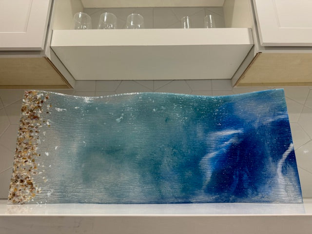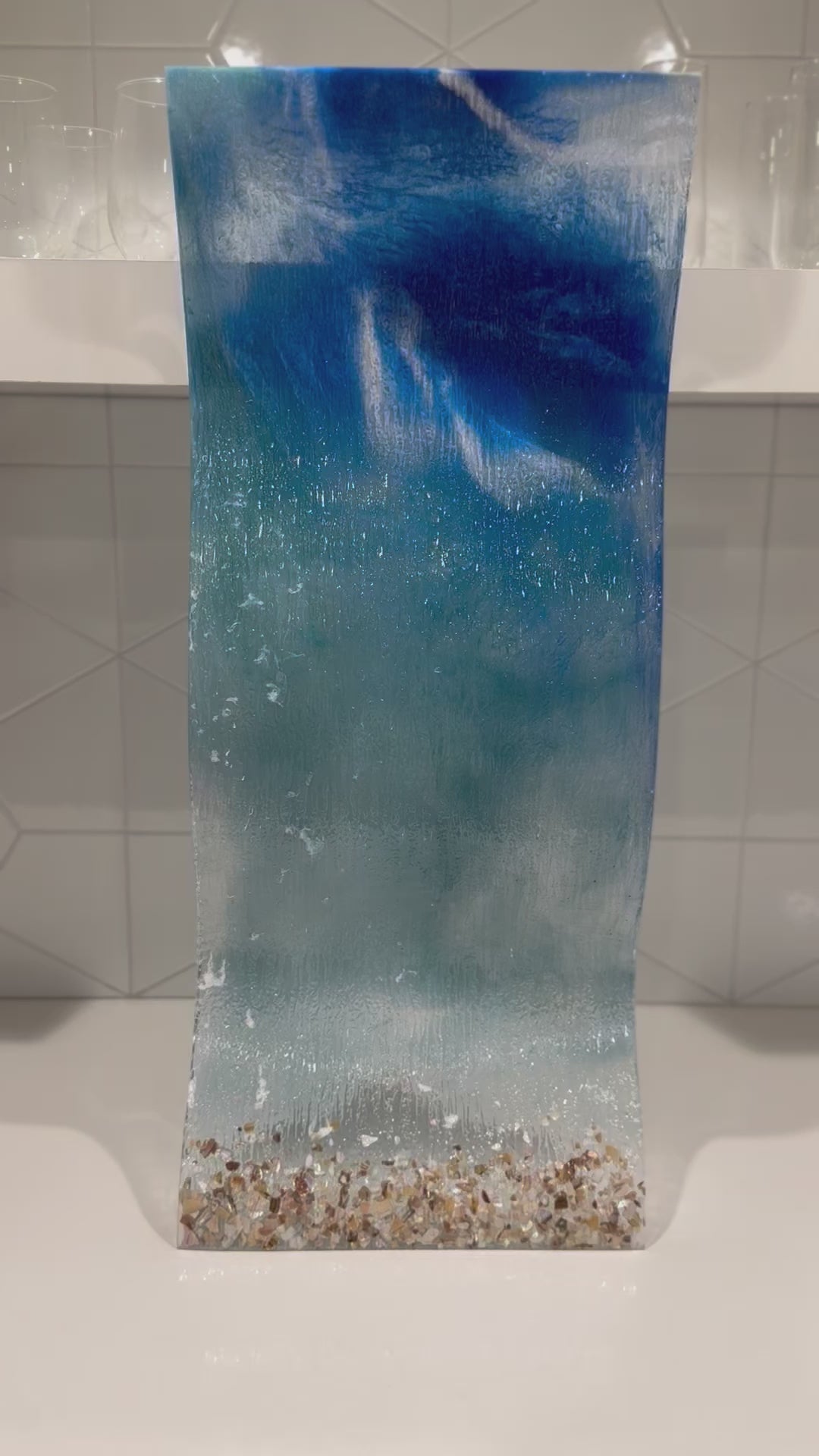 This is the first edition of the Flowin Solo series. Resin ocean wave size is approx. 12" x 29.5" x 3/8" Waterfall texture with blue water hues and seashell shoreline.