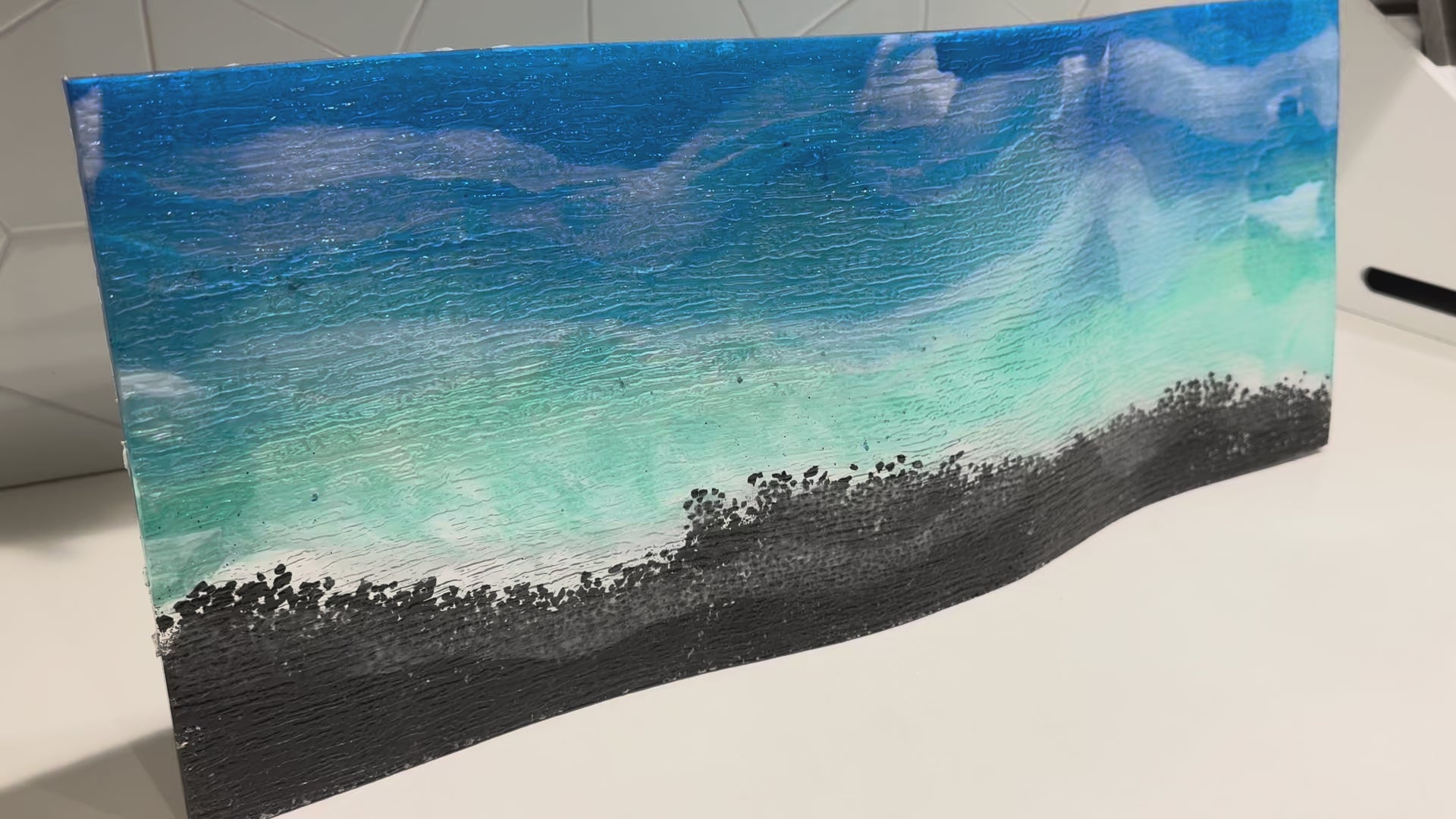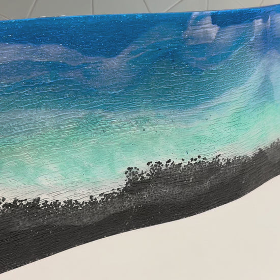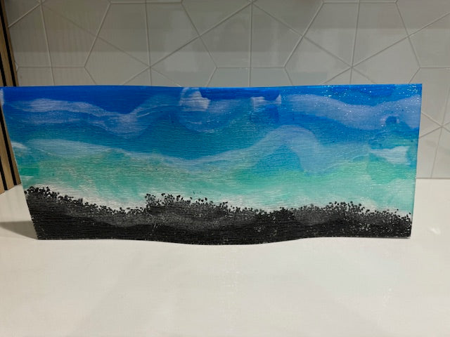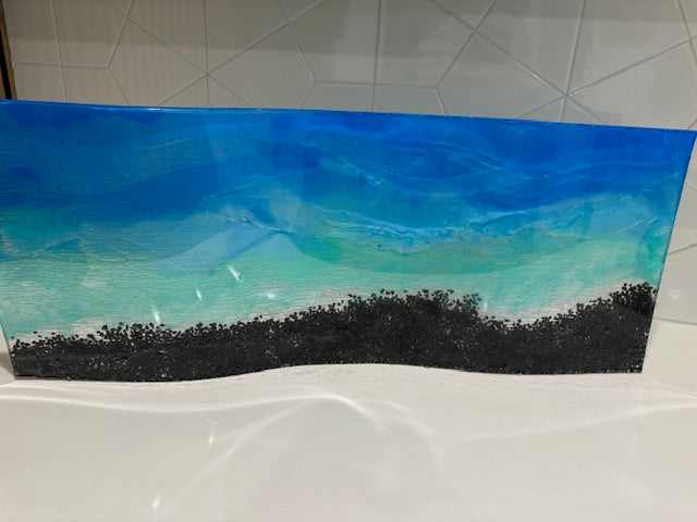 Inspired by the black sand lava beaches in Hawaii. Resin ocean wave size is approx. 12" x 29.5" x 3/8" Waterfall texture with blue water hues and lava shoreline.