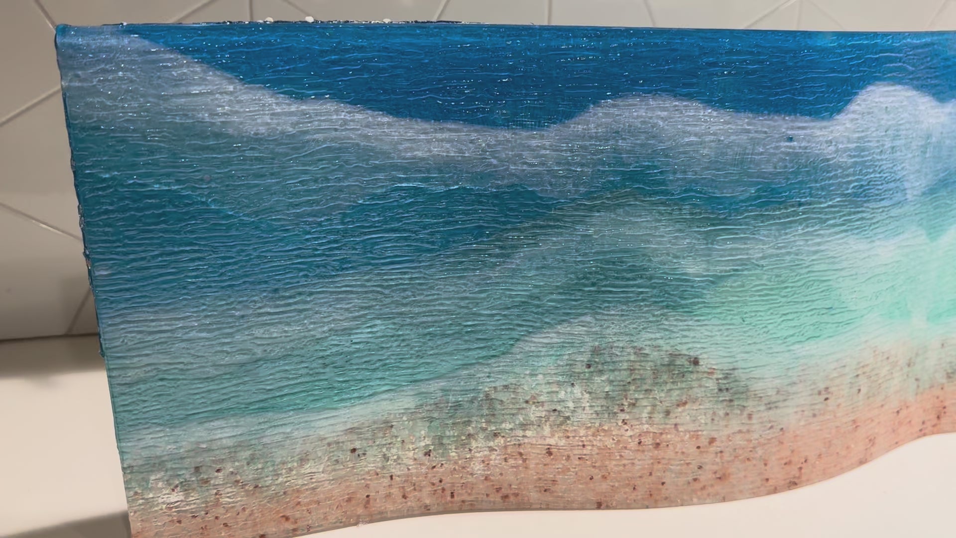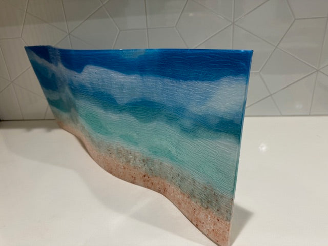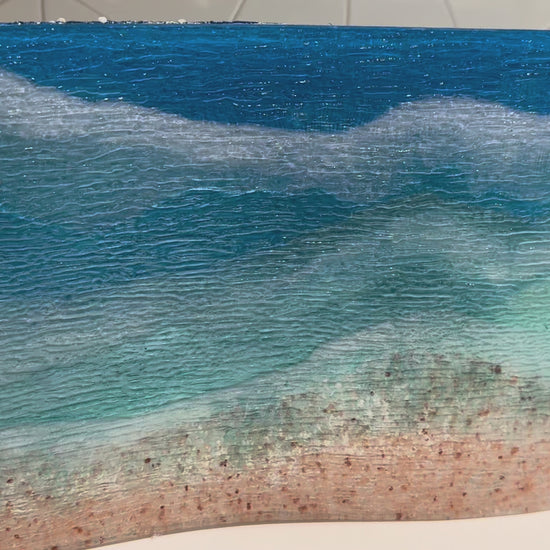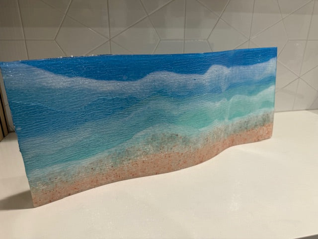 Inspired by the pink sand beaches of the Bahamas. Resin ocean wave size is approx. 12" x 29.5" x 3/8" Waterfall texture with blue water hues and pink himalayan salt shoreline.