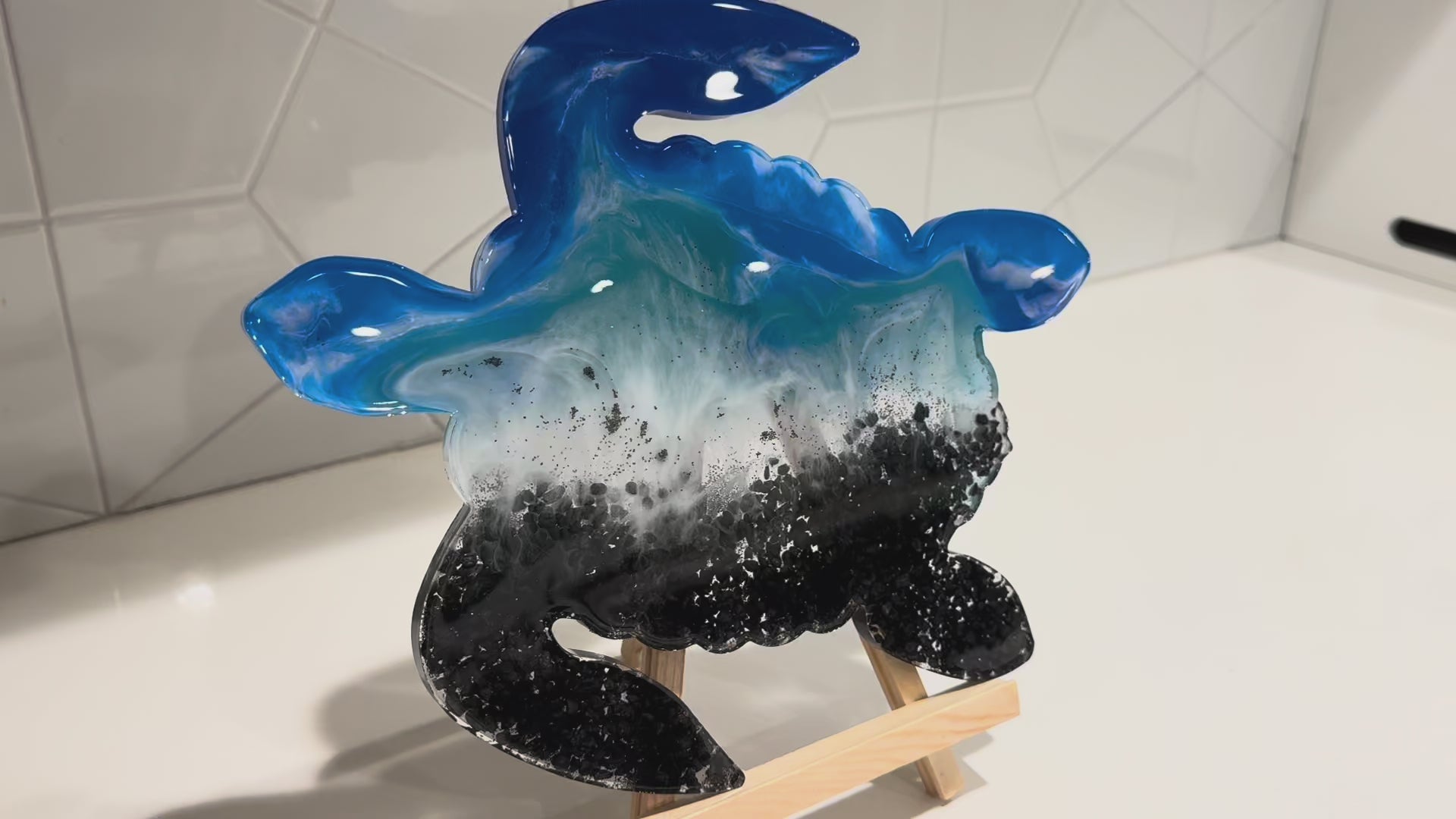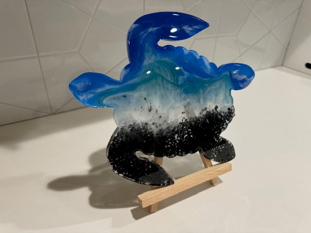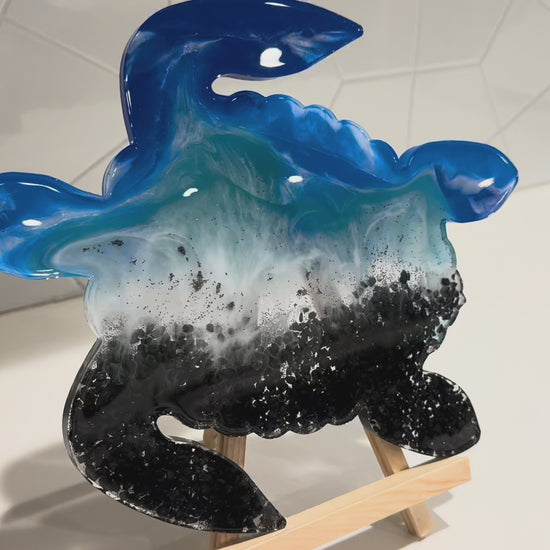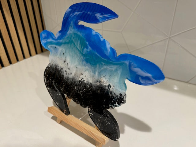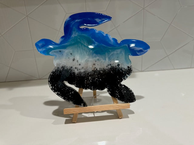 This is where it all started, my love for sea turtles and art. Resin sea turtle size is approx. 13" x 11" x 1/2" This piece has beautiful blue ocean waves and black sand lava shoreline. The wood easel is included, ready for display.